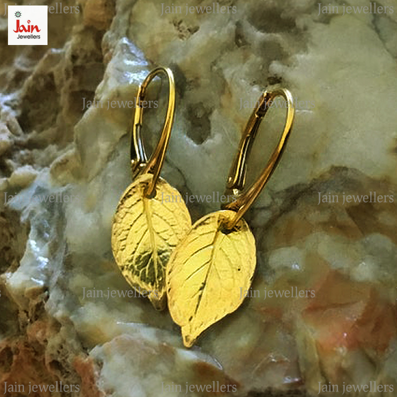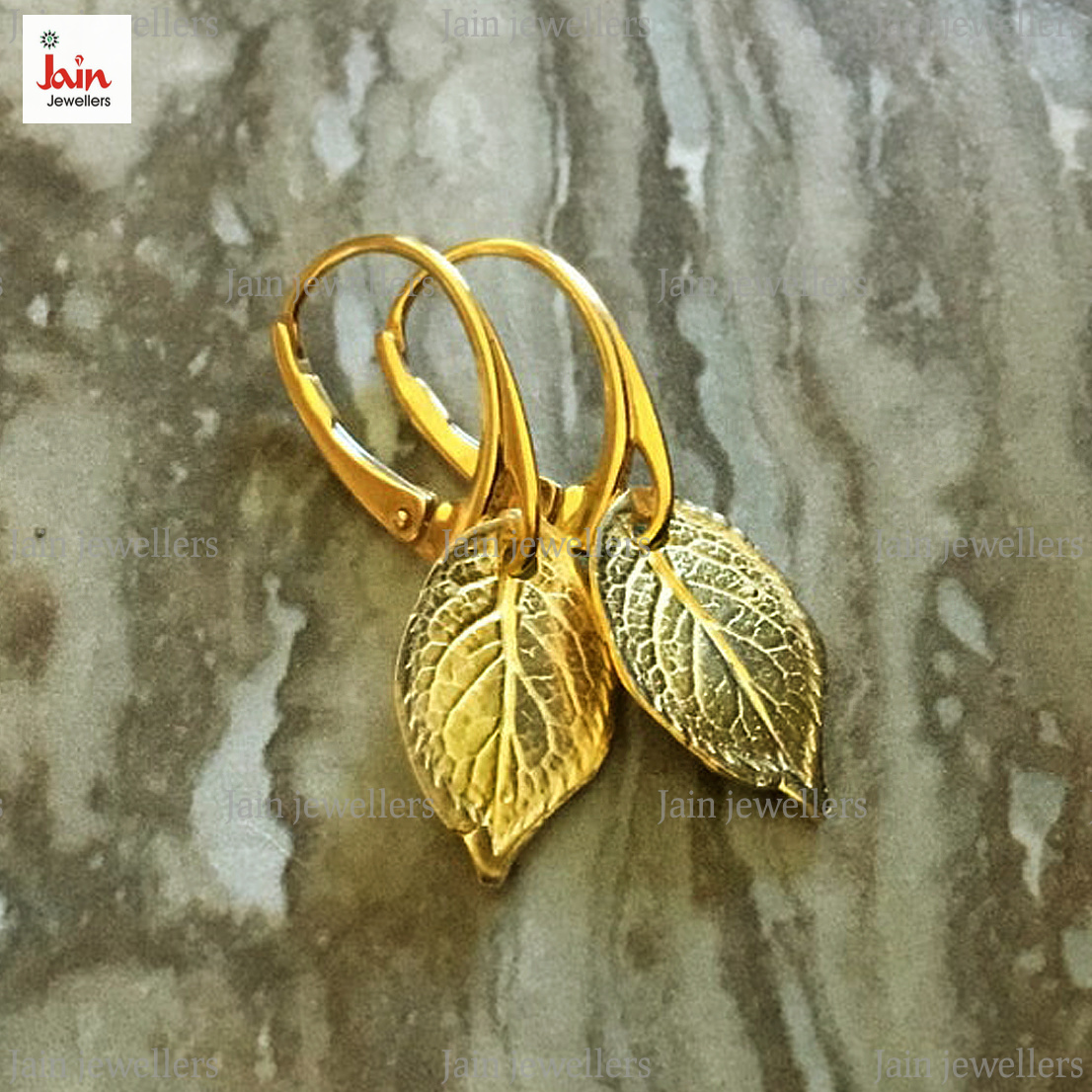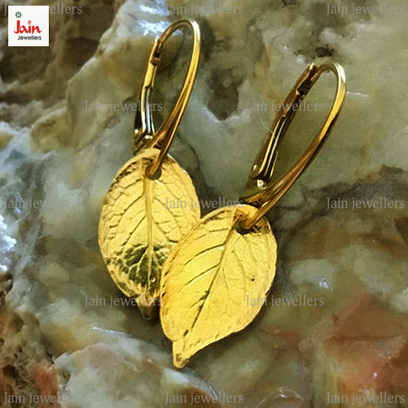 18 Kt Real Solid Yellow Gold Rose Leaf Premium Lever Back Dangle Drop Earrings